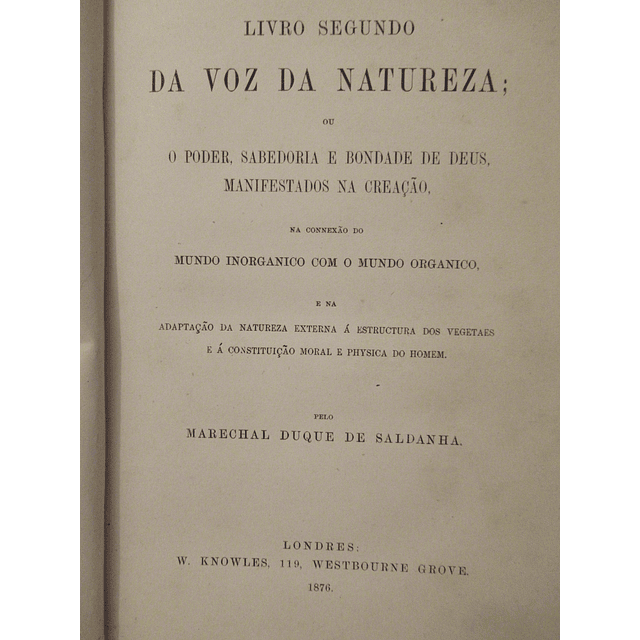 Livro Segundo Da Voz Da Natureza, o poder, sabedoria e bondade de Deus, manifestados na criação, na conexão do Mundo Inorgânico com o Mundo Orgânico e na adaptação da Natureza externa á estrutura dos vegetais e á constituição moral e física do Homem